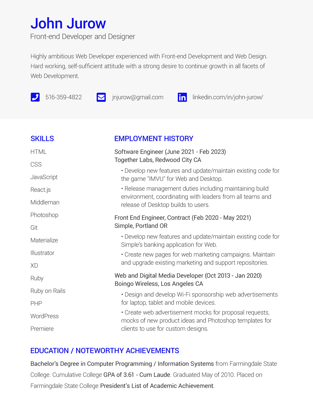 I like to make great looking and functional websites. I have eight years of experience with Front-end Development and Design. I graduated from Farmingdale State College with a Bachelor’s Degree in Computer Programming / Information Systems. I enjoy learning new technologies, hiking and making music.
